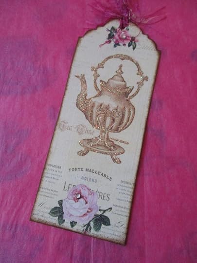 I'll be out of town at a crafting retreat this weekend, and I'll be taking this tag along a) to show off to my friends there and b) to use as inspiration! Interestingly, this pretty tag features a tipping teapot, one of which I took on my last crafting retreat when we all had tea together!