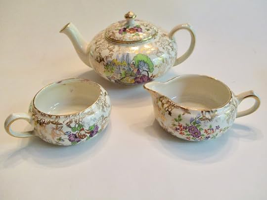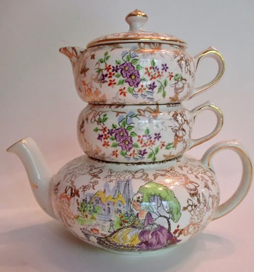 A few tea wares have been on my bucket list for a while. One of them is a stacking teapot, but they're a bit on the pricy side when I spot them online, and like a lot of things, I didn't want one that bad. Still, when I was checking out antique stores in Griffin last Wednesday, I went to one called Treasure Seekers, and this flat little teapot, sugar, and creamer caught my eye. Could it possibly be …?