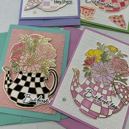 This weekend, I once again attended the "Crafter's Fellowship" at a nearby Lutheran church, Word of God Lutheran in Sharpsburg. I love these ladies and am very fortunate to have found a local group to craft with just ten minutes from my house. This time, I was all about the card making, as I was eager to use the new Scrappy Boy teakettle dies I picked up at the Expo last week. I love the color possibilities with these dies!