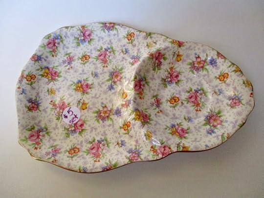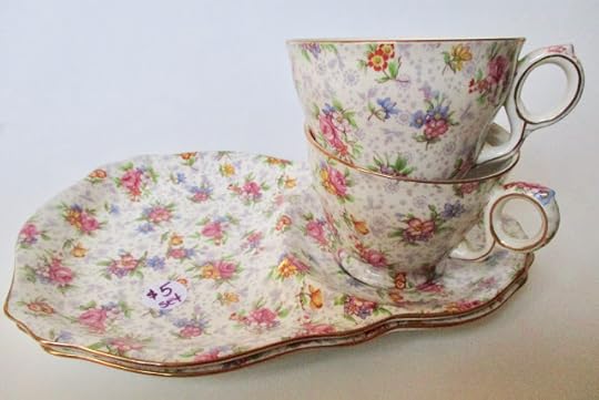 Those of you who've read this blog over the years may recall that I like chintz tea wares. Alas, vintage chintz wares are usually far more expensive than I'm willing to pay, but I consider myself very fortunate to have acquired a full tea set of a newer chintz pattern, Royal Winton's gorgeous Welbeck chintz, many years ago. Those purchases were made largely thanks to my friend and eagle-eyed shopper, Sandra, who alerted me as pieces drifted in at our local T.J. Maxx. But vintage pieces? I just haven't seen them very often at all, and when I did, they were definitely out of my price range. So can you imagine how much I was jumping for joy when I found these two Royal Winton Eleanor chintz snack sets for just $5 each at a thrift store in Carrollton on Saturday?