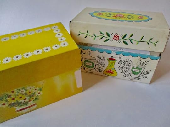Why do some of us love nostalgia so much? I've loved old things all my life. I believe I've shared here before that one of the first words I learned to read was "antiques," and I just find old things a great source of wonder as well as comfort. So when I saw an old tin full of recipes at a local antique mall last fall, I bought it. I was in that same antique mall the other day, and the seller on duty happened to be a woman I go to church with, and she asked, "Don't you like old recipes? Did you see those boxes of them in that case on aisle one?" Well, I did not see them, so I'm grateful for the tip that pointed me to the cabinet, and the yellow box is my latest acquisition.