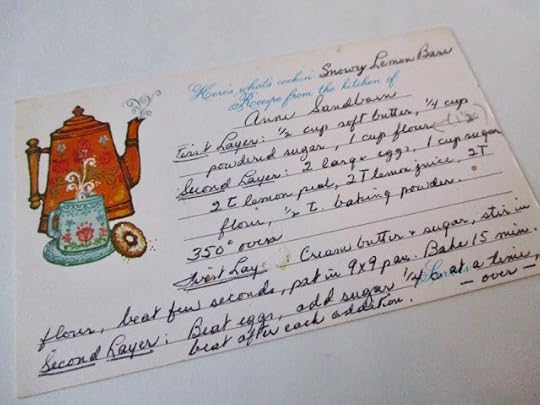 And remember when we did indeed *write* our recipes on pretty cards to share with friends? This tea-themed recipe card—for Snowy Lemon Bars, appropriately enough—looks very seventies to me.