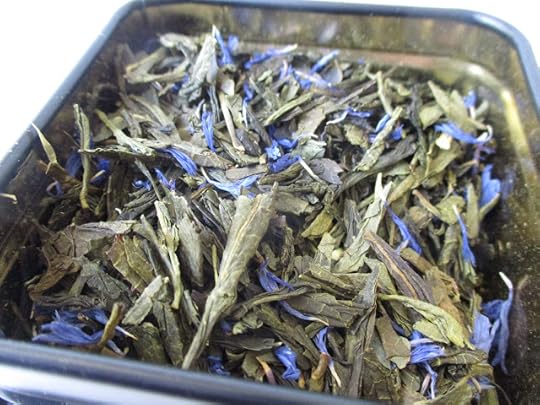 A flavored green tea, Island Dreams has pineapple, coconut, and rum flavoring and blue cornflowers.