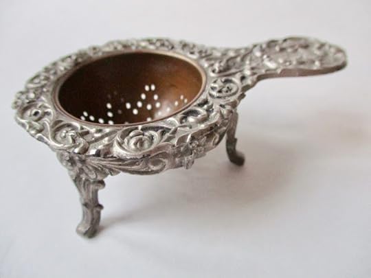 I sometimes think I've tried about every kind of tea strainer that exists, but I spotted one at an antique mall in Fayetteville last weekend that just spoke to me! I don't even really like to use fancy tea strainers anymore, preferring those cup-size tea filter baskets, but I do like a pretty tea strainer purely as a teatime collectible. This one with its little footed stand caught my eye soon after I walked into the store.