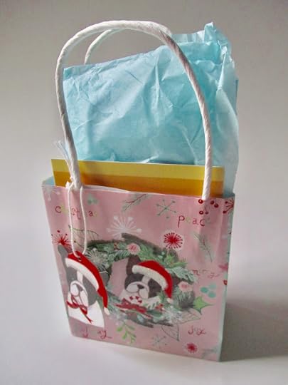 Earlier this week, I went over to my friend Kathy's to craft for a few hours. As usual, I walked over to "my" desk and seat in her studio, which is brimming with yummy stamp sets and dies and paper and markers and crafting machinery that I can only dream about. When I got there, this cute little bag was waiting, decorated with a tag featuring a Boston terrier like the beloved pets my friend has had for many years.