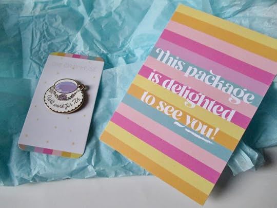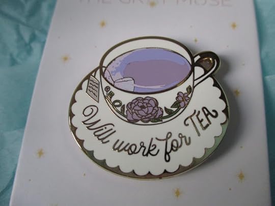It's an adorable little enamel lapel pin (just over an inch wide) with a rose-patterned teacup on it that reads, "Will work for tea," and that is so true! Isn't this just the cutest thing? I was delighted! And if this is your cup of you-know-what as well, you can find the maker's website here.