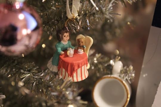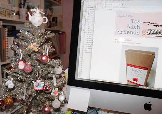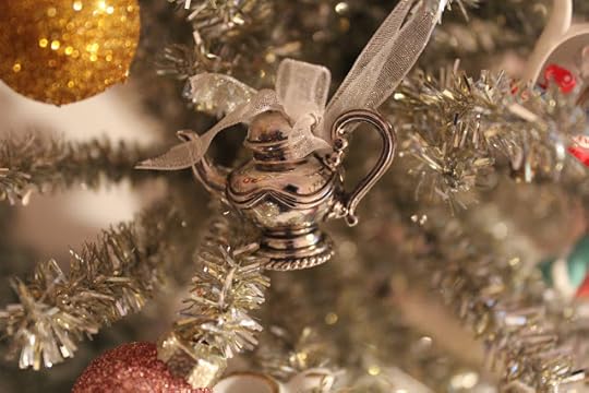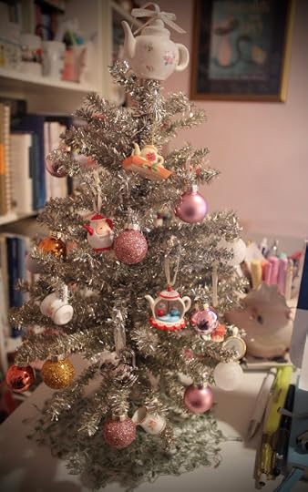 It dawned on me that I might enjoy my fourteen-inch-tall tea-themed tinsel tree even more on the desk where I actually spend many of my waking hours, so this year, it’s displayed to the left of my computer, and I must say I’m liking it here—and haven’t knocked it off so far (knock on wood). When I pause during my workday to consider something that I’m writing or editing, I find myself staring at the tiny ornaments and “seeing” them even more.