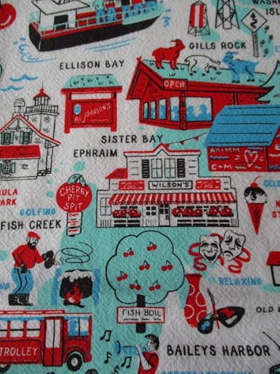 We did indeed go to some of these sites, including the restaurant with goats on the roof, and we enjoyed a fish boil, too, so I absolutely love this tea towel and its vintage look.