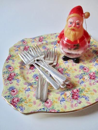 On Saturday, I helped Aunt Jane finish up her gift list, and I was very glad when the "have-to" shopping was complete. Stores have reached that crazy point where stock is low, chaos is high, and nerves are shot. I don't care for that kind of shopping, so we also headed to an antique mall and a thrift store, where kinder, gentler shopping may be enjoyed. And the antique mall is where I found a Royal Winton Welbeck dinner plate and this cute vintage Santa figure. The eight vintage silver plate pastry forks, a wish list item, were fun finds at a local antique mall last week for just $1 each!