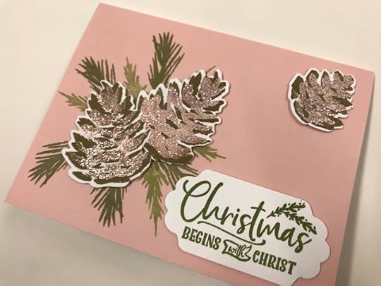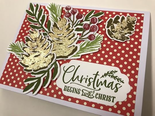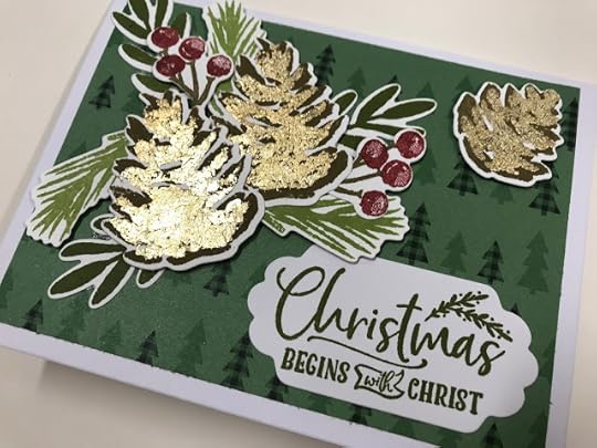 And let me just tell you what an experienced card maker I am. I'm *so* experienced that I ordered two colors of brown ink that were so similar, you couldn't tell that the pine cones of this Stampin' Up stamp were supposed to be two different colors. And naturally, I didn't bother to open the ink and test it until I got to Pine Mountain. Sigh. My intention was to make this Christmas Season design from Stampin' Up the primary design for family and friends' Christmas cards this year, so this ink thing presented a problem. Happily, I had packed the gold leaf I learned to embellish cards with earlier this year, and voila, we now have gilded pine cones. I could totally live with that!