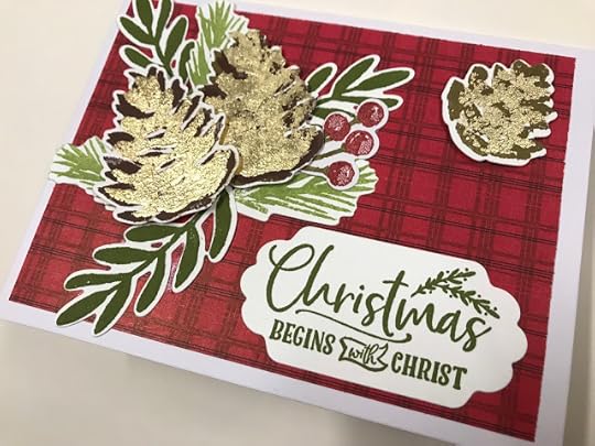 In fact, I love to stamp designs and then cut them out with my dies, so I cut out a *lot* of pine cones this weekend. The challenge is, I don't like for any two cards to be exactly alike. So then I decided red plaid might be nice.
