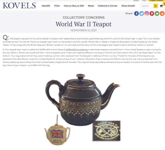 But what I do know is that I was most intrigued when reader Diane M. emailed me a link to this article from kovels.com, featuring a similar teapot that has the fascinating back stamp, "World War II, Made in England, Escorted to United States by the Allied Fleets." I'm quite sure my old teapot didn't have that mark, because I certainly would have latched on to that story, and I would love to come across such a teapot with the original hang tag!