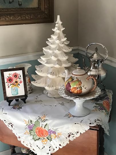 This year, I've found so many great vintage Christmas goodies that I am itching to get started on the decorating. But I'm also hosting my side of the family for Thanksgiving, and I want it to look like Thanksgiving. But this week, I had the great fortunate of buying two vintage ceramic Christmas trees from a local friend who knew I was looking for some at a good price. I got a large green one for $15 and this huge (eighteen-inch) white one for $30, and when I went antiquing later in the week, I was shocked at how much similar trees cost. I liked them but wouldn't have paid $100+ for them, so I lucked out with my friend's great prices. And I'm so enamored of this white tree that I decided I would go ahead and have it grace the Thanksgiving tea trolley.