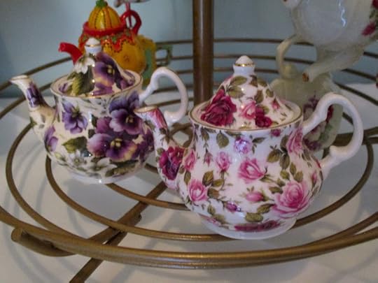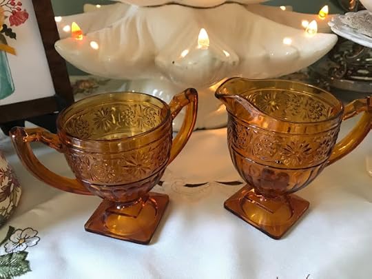 My tea trolley always looks a bit cluttered because I simply don't have the eye for styling that so many others do, but oh well. I like looking at these goodies, like the $1.99 sugar and creamer I found at a Goodwill in Wisconsin over the summer. They will get some use at Thanksgiving!