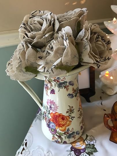 And my Mackenzie-Childs enamel pitcher, another Goodwill find, has the right color palette as well. So who has been decorating for Thanksgiving? Anyone got their Christmas decorations up yet? No judgment here, and I may just put up a Christmas tree or two by the time Thanksgiving actually gets here!