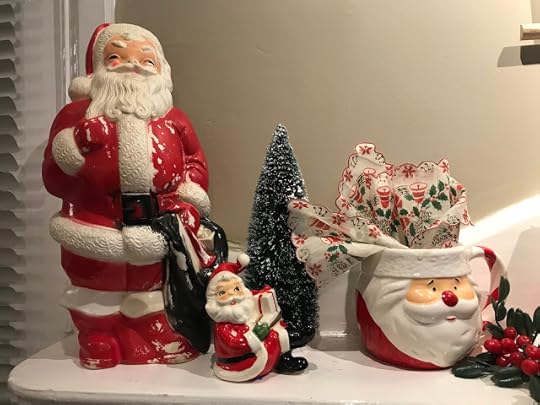 What made the evening even more delightful was all of the vintage decor that they shared, from vintage Santas and old Christmas hankies …