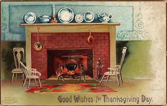I was looking through my stash of vintage postcards recently and would have sworn I had already scanned this one and shared it here before, but as I scrolled back through years of Thanksgiving posts, I couldn't find it, so here's the story: first, I had to have this card when I saw the pretty blue-and-white teapot on the mantel and also because it says "Good Wishes for Thanksgiving Day."