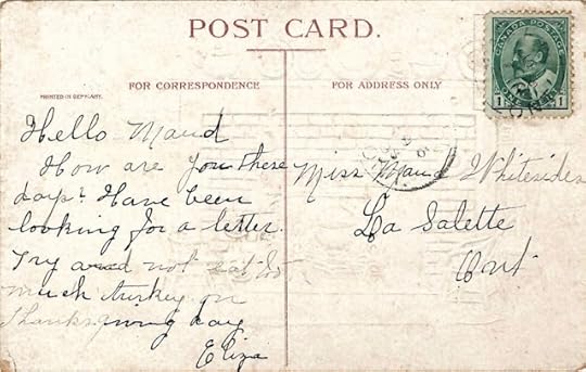 The message, though, makes this card even more fun. The back of the card is addressed to a Miss Maud Whitesides of La Salette, Ontario, Canada, and reads, "Hello Maud, How are you these days? Have been looking for a letter. Try and not eat too much turkey on Thanksgiving day. Eliza."
