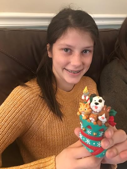 For those of you who've kept up with my nieces and nephew over the years, I thought you might enjoy seeing a family update. I always take a picture of them opening their new Christmas ornaments at Thanksgiving, and here Amelia, now 16, gets an ornament featuring a stocking full of animals since she's the big animal lover in the family.