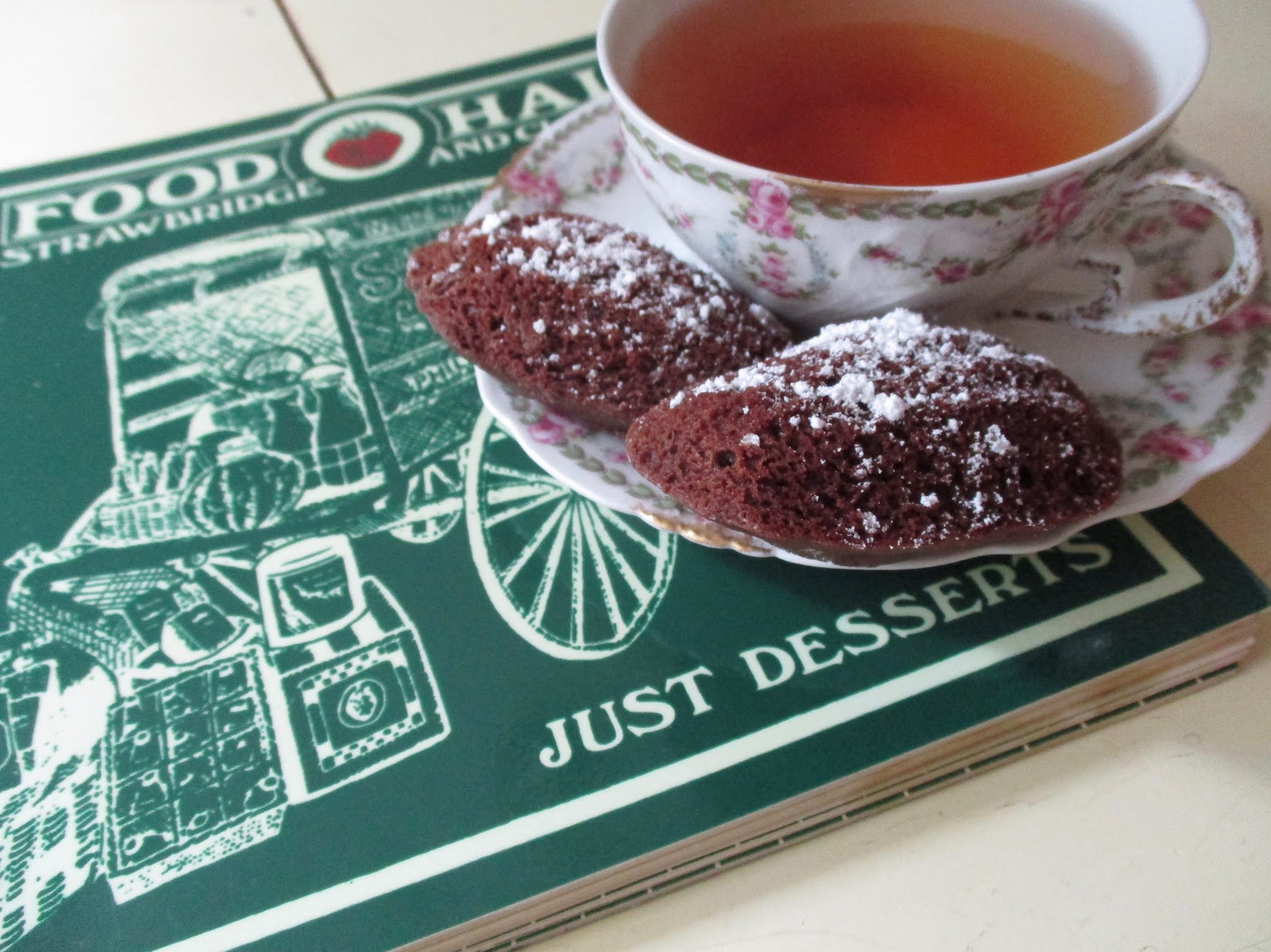 Now that my latest novel is finished and I'm back to working on the next one, another cozy mystery, I'm thinking about my next nonfiction project, the sequel to Dainty Dining. So over the weekend, I tried another recipe associated with a grand old department store, this one the Chocolate Madeleines from the food hall at Strawbridge and Clothier in Philadelphia. These madeleines were easy to make and came out great, so I thought I'd go ahead and share the recipe here. I love to serve madeleines at teatime, but I've always made the traditional lemon-flavored ones. These chocolate ones were perfectly light and cake-like, sweetened with the tiniest sprinkling of powdered sugar, and I'll bet some of you would like them too!