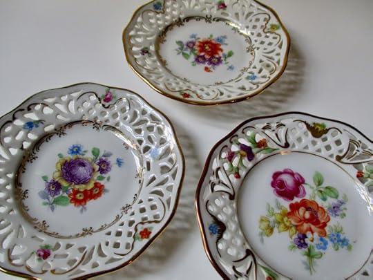 Another odd collecting interest: I like *reticulated* things, which is a fancy word for china with piercings in it. These little 4-inch Schumann Bavarian dishes look like future jewelry trinket dishes to me, and at 99 cents each, the price was right.