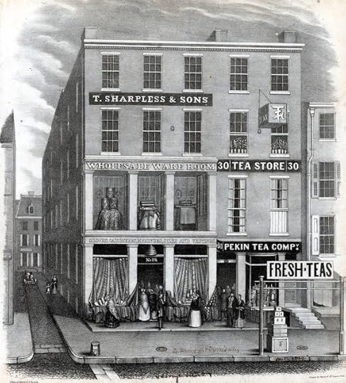 I don't imagine I will ever tire of researching the tea history of this country. Recently, I came across an 1846 advertising print on the Library of Congress website here. It's an ad for T. Sharpless & Sons in Philadelphia, and it's fun to see how prominently tea is featured in the image.