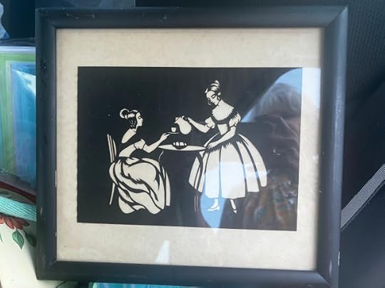 The organization of the event, not surprisingly, was first-rate. Our digital tickets were quickly scanned, and volunteers were absolutely everywhere, eager to help direct us. You simply told them what items you wanted appraised, and they pointed you to the area for that category of appraisal. Both of mine, I learned, fell under Folk Art, and while neither was valuable, I did end up discovering a few things about them, just as I’d hoped. The silhouette might or might not have been die cut, I learned, and the only way to find out for sure would be to take it out of the frame, which would likely damage it, so I’m fine with not knowing. The appraiser said it appeared to be an Art Deco piece, which was news to me. I had assumed it was Victorian and placed in a newer frame. The antique sampler, the other appraiser said, does indeed look right for the 1816 date at the bottom, though, like me, he couldn’t read the name and noted the faded letters. He asked if this was a family piece, and I said oh no, it was something I found at a thrift store, and he said, “Good!” (You know the Heritage Society’s august Timothy Neville from Laura Childs’s tea shop mysteries? That’s who this guy reminded me of.) Because the piece is so worn, he said that it’s worth only about $50, which happens to be exactly what I paid for it. (And I’m still happy with that purchase!)