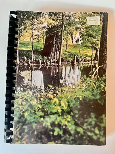 On a visit to the antique mall during my recent crafting retreat, I found this large (8x10-inch) comb-bound book titled Bayou Cuisine. It has lots of tempting regional recipes, including a bacon-and-avocado dip I just made, and it has three recipes for teacakes that I'm hoping to try soon, but the real reason I had to have this was because of the sticker on the cover, showing that this once sold for $9.95 at my beloved Rich's!