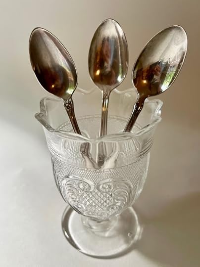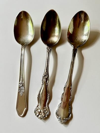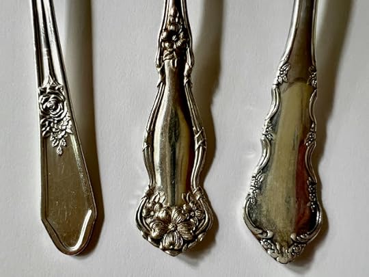 Now that I use Google Lens on an almost daily basis, I no longer have to wonder about what pattern something is. Now I can know! And so it was that I went digging for more info on my vintage silver-plated wares. These three spoons in particular are currently making me quite happy, especially after I pulled out the Wright's Silver Cream and polished them. These patterns are, from left, Rosedale Manor Plate, Arbutus by Wm. Rogers and Son, and Dresden Rose by Reed and Barton. No piece is valuable at all, and I'm pretty sure I paid no more than a dollar each for these, but I think they're such lovely spoons from yesteryear.