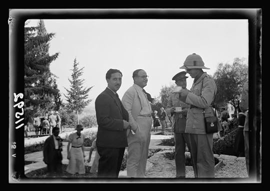 This photo's very long title is “Galilee trip. Nazareth, afternoon fete in aid of the Red Cross & Knights of St. John. Tea, group in garden taking tea, District Officer Mr. Wadie Issawi in centre.”