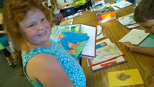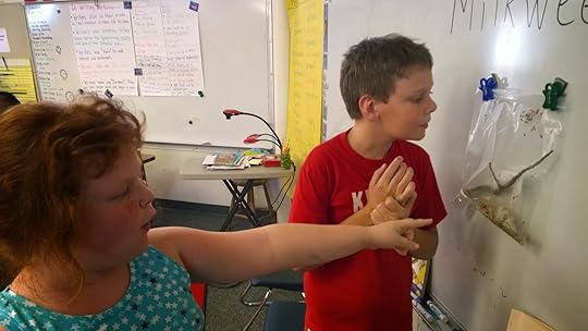"Awesome, hon. I'll look forward to seeing that."Well, I did get to see the meal worms, and the milk weed bugs and the other accoutrements of second grad science, God love all second grade teachers everywhere. Of course, because she's Squish, she wanted to show me the meal worm up close and personal-- she even dumped it out of it's vial and onto the special piece of paper they use to poke the meal worms to make them more active. (I shit you not. It's part of their day.) Anyway, she did that, and then couldn't get the meal worm back in it's vial and then…
