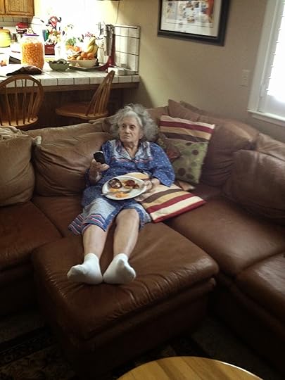 I'll talk about what they said they did and what I found out in the course of my research when the book gets a little bit closer to release, but for now, I want to concentrate on the pictures I chose. One of them is of grandma, a few months before she passed away. In a way, it's sort of an unfair picture to share-- she's vulnerable. Old, infirm, content to wield the remote control and deal with her discomfort and will the confusion of the world to go away. (I was looking for a picture of grandpa, and I know there's one in my phone, but I don't know how to make folders and it's just so chaotically organized-- hottie, hottie, hottie, drawn hottie, meme, hottie, thinly disguised peen, grandpa in a wheelchair, hottie, hottie, meme… I figured I'd stick to grandma, since she was easier to find.)