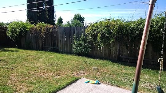 And in the backyard whence all things are possible…"Look- look, Mom! Gordie has a dead bird! And he's trying to get into the house!" (This from both kids, screaming and waving arms in excitement.)