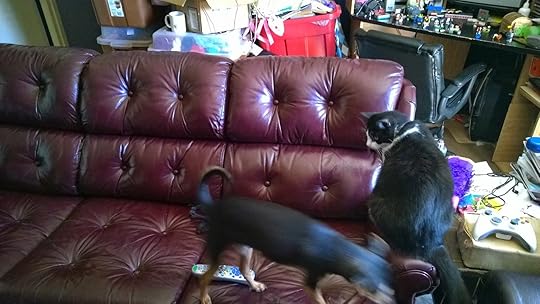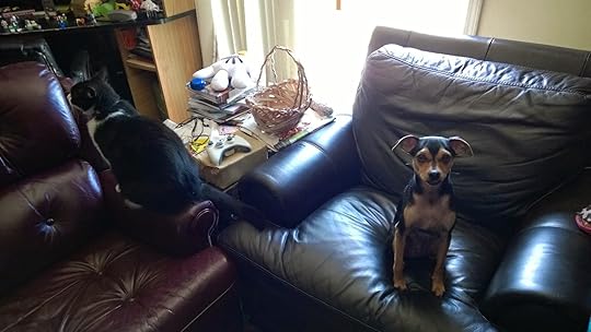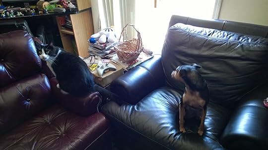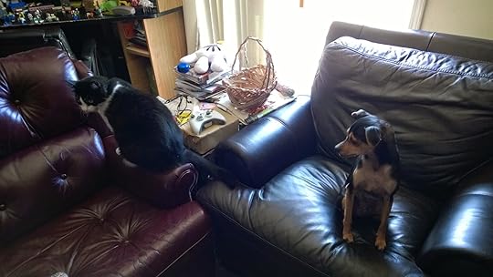 Anyway, that's the animal function in our house (and pause here to admire the series of pictures I took of the cat and the dog IGNORING THE HOLY SHIT OUT OF EACH OTHER) but I should mention that while I was away, Mate managed to establish ABSOLUTE DOMINANCE over the dog. Jonnie will be licking my face and bothering me when I'm trying to yarn in front of the television. All Mate has to do is yell at him once and he goes straight to his (get this!) dog bed, and retreats in wounded silence.