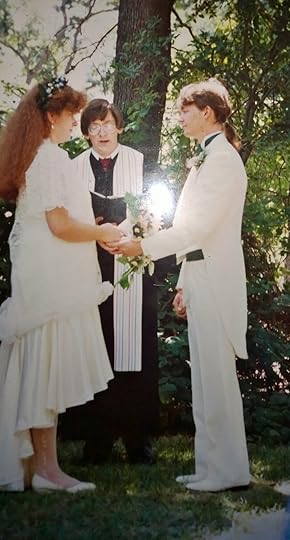 The day of the wedding the bridesmaids and I all gathered at my friend's parent's house and stressed about getting ready. I remember that I was helping all of them getting ready, and suddenly I was running late. I almost hit a squirrel driving my AMC Pacer from Julie's house to the park-- I drove myself to my own wedding, go figure! My 'hairstyle' consisted of wearing it, dry and down on my back--because I never wore my hair down. In all of the pictures, it's HUGE-- just a giant writhing red mass, with a little crown of synthetic flowers. (Oh yes-- my friend's mom did the flowers--synthetic, most of them, although I think my own bouquet was real.) Remember, this was the 80's, so the whole "virginal white" dress was still a thing, and I was obviously not a virgin, so I went with off white. I figured it was just as well-- I look sort of awful in white-- ecru was obviously the way to go. But I remember pulling into the parking lot of the park running late, and running into Mate's aunt and grandmother as I dashed to the trailer where my dress sat.