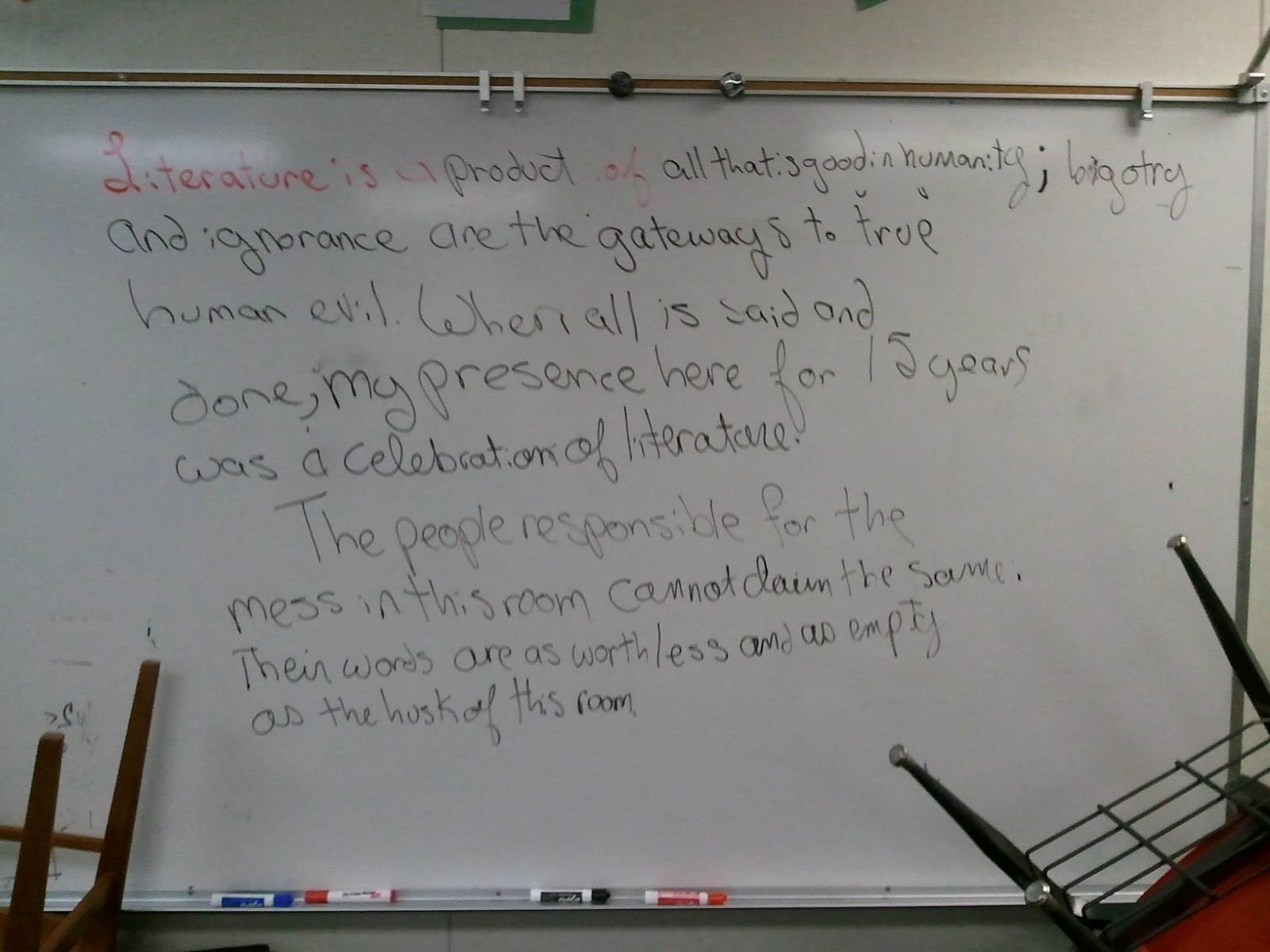 When I was told that I wasn't going to be teaching the next day, I left a note to my students. I made it light--I said I was in the doghouse, and that I didn't know when I was coming back, but that they needed to respect the sub, and trust that their grades would count. I felt like this was important to do-- two years before, we'd had a rash of teachers quitting mid semester, and leaving their grades in disarray. I'd taught a number of kids who had to take a class completely over again for no fault of their own. That promise was important, I felt. I knew who their sub was going to be, I knew she wouldn't let them down, but I knew they needed some reassurance or they'd be unmanageable.