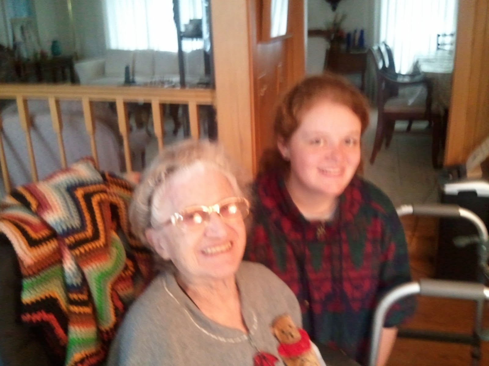 I was the oldest grandchild, and because of my mom's illness, I was always a little out of place. Grandma tried very hard to give me a place. There is a picture of the two of us--I had just gotten one of those awful bi-level cuts of the early 80's, but if you held my hair up, my fuzzy red curls matched grandma's, (hers were from the bottle by that time, as are mine now!) and our glasses were a lot alike, and she really did look like my mother. We were that much alike.
