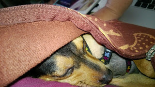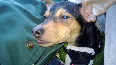 Including this. This is the obnoxious little dog who was totally spazzed out at my parents. He also got crated when I met with an old teaching buddy for lunch. (She has since moved, and was in town for a conference. It was GREAT seeing her again, and the whole family came. NO little dogs allowed!) Anyway, he's getting some much needed R & R here, tucked between my jacket and my shirt. Because you can't have enough of that in your life.