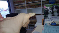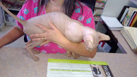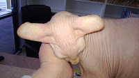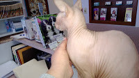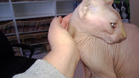 Yeah, sure, they say he's an Egyptian hairless, but he wouldn't let me get a picture of his sunken, demon-yellow eyes. So, while he loved on me, loved on the receptionist, and loved on my phone while I was taking the pictures, I remain convinced he was not a heavenly creature. But that's okay-- I'm a pagan, heaven is overrated. The truth is, petting him felt like petting a warm blooded, stubbly snake, or a REALLY BIG shaved scrotum, and while I wouldn't tell HIM this (because, did I mention? He was a total love?) the fact was, I missed fluff while this cat was attempting to seduce me with his giant scrotum body. I mean, I get it-- his entire ATTITUDE was fluffy, but, well, fluffy can't always be boiled down to attitude. Sometimes, it has to be an honest to God tactile experience, and this cat gave a different tactile experience, and I think it would take some getting used to. Not that he wouldn't be a wonderful pet, and a very rewarding one (his purring shook the counter) but they had another cat there, an orange tortoiseshell, and I'm firmly convinced the second one was just so they could bury their hands in his fur.