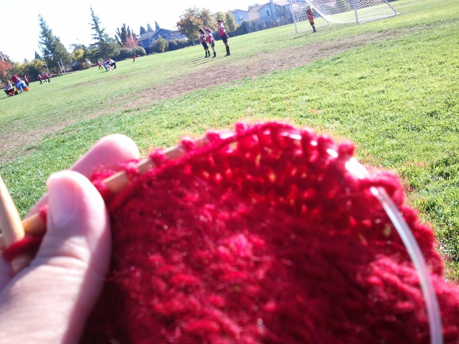 Is Mom seeing red? No, just her knitting.* Of course, to highlight what an idiot I'm capable of being, I should tell you what happened before we went to see the movie. Mate and I had dinner beforehand (some place without a tablecloth, as Mate has categorized most dinner places in our comfort level) and we finished with about an hour to spare. As is traditional, we often park the car at the movie theatre and sit and surf our phones or knit, and talk. Sometimes, if the day has been particularly long (and this one was--started with soccer, moved on to cleaning the house for hours) and the movie is late, we'll cop a nap before we go in, and we both did this time. So, nothing makes you feel more impotent and useless than lying in the middle of a half-nap, listening to BAD Christmas music and being incapable of leaning forward to forward to another song.