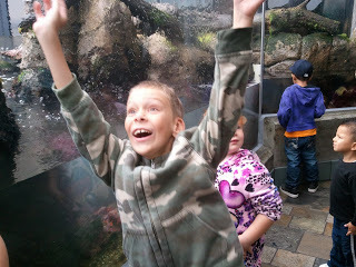 We go there as often as we can. Something about the lovely, seventy degree climate, the aquarium (which you can see Zoomboy enjoying with oomph!) and the smell of the sea makes the entire family gazunga scads of happy. Mate, my beloved Mate, who has not really had a vacation out of town that didn't involve work in a LOOONGGG time, was also gazunga scads of happy.