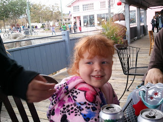We go there as often as we can. Something about the lovely, seventy degree climate, the aquarium (which you can see Zoomboy enjoying with oomph!) and the smell of the sea makes the entire family gazunga scads of happy. Mate, my beloved Mate, who has not really had a vacation out of town that didn't involve work in a LOOONGGG time, was also gazunga scads of happy. We ate crepes (Squish liked hers with apples and cinnamon),