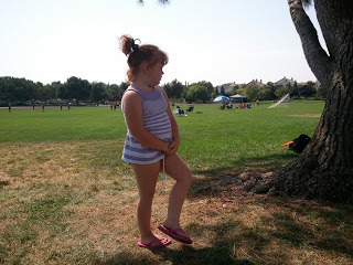 Well, it made her happy, but it reminded ME that I need to clean out her clothes hamper more often, because that outfit is a lot of things, but FITTING HER BODY is not one of them. So the day was hard--for the soccer players more than the soccer mom, who sat at the sidelines and sucked down water and thought longingly of actually WRITING since, yanno, that is sort of her profession. Actually, though, at Chicken's game, I DID start getting unaccountably bitter. Bitchy. Moody. I mean, more than usual. You know, it's AMAZING what skipping lunch can do for a person? Seriously--if it wasn't for a granola bar in the bottom of my purse, I might have killed someone.
