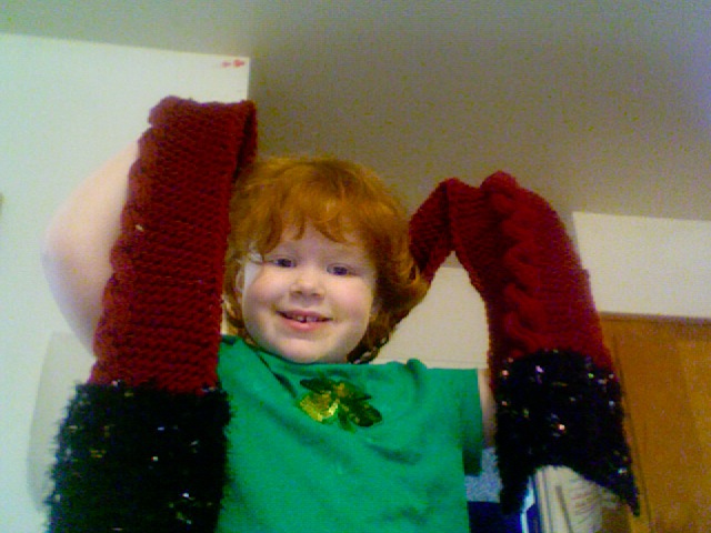 And that's why I led with my kid showing off scarves. The first one is in her two favorite colors--pink furry and pink shiny, and the second one is for Littlewitch, who asked for something in vampire blood with maybe some black, and now she will maybe stop pasting "Write bitch!" on my Facebook, because, you know, knitting is good on her end too!
