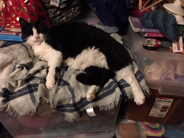That blanket she's on used to belong to Squish. I reorganized my yarn and ZoomBoy put it on top of the boxes as a decorative thing and Steve... made it hers.