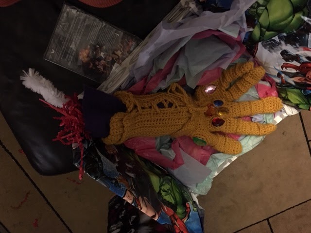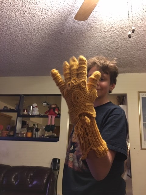 (btw-- he is trying to pose with the glove doing the Thanos snap from the movie, but it doesn't show off all the jewels... just saying, we do love a bit of detail here!)
