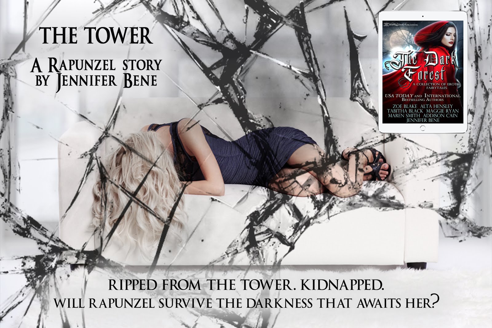 THE TOWERA Rapunzel story by Jennifer BeneRebecca 'Rapunzel' Sinclair has spent her entire life in The Tower. A forty-two story monument to her father's tech company where she lives and works, trying to be worthy of Daniel Sinclair's incredible legacy. But while her father has kept her sheltered and safe, he has also made enemies, and when one of them rips Rapunzel from The Tower and takes her prisoner she is dropped into a nightmare of pain and pleasure. There are secrets this damned prince knows, and a dangerous history behind his motivations. As her masked captor works to break her down will she be able to face the darkness in her past, and the dangerous desires she's discovering inside herself?