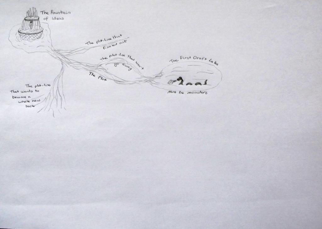 I've drawn a (terrible!) map of how writing a book goes for me (click on it to enlarge it). It starts with the Fountain of Ideas. This represents that glorious time when anything is possible in a book and no ideas are too daft. It's "play time" when my imagination gets to run mad, and ideas chase each other and twist and morph into new plot lines. It's a heady time. It's where I've been for the last few weeks.