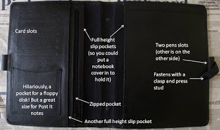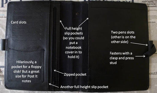 A long time ago, I posted about converting an old Filofax Deskfax into a writing folio. You can read that post here. Essentially, I took the ring mechanism out and added strings. The layout of the Deskfax meant that I could slide the cover of a B5 notebook into a back slot. The added strings could hold thinner B5 books. The various pockets and pen slots could hold Post-It notes, pens etc.