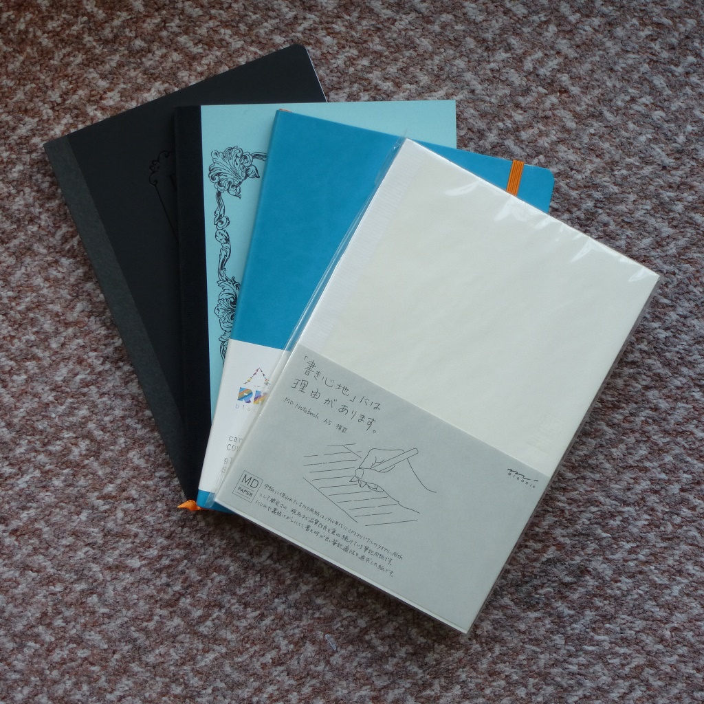 Taroko Design Breeze A5 (Tomoe River paper, numbered pages, table of contents, dot-grid paper)Rhodia A5 soft cover (Rhodia paper, dot-grid, no TOC or page numbers)MD notebook A5 (great paper, lined, no TOC or page numbers)Life A5 notebook (great paper, lined, no TOC, no page numbers)